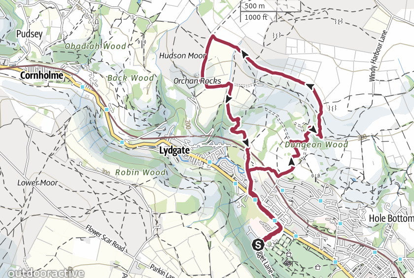 Crossing the A646 we travelled North along Stony Royd lane turning East and upwards to Cross Lee and skirting Dungeon Wood to Whirlaw and Stony Lane joining the Calderdale way. At Higher Hartley we turn South towards Orchan Rocks eventually reaching a metalled road and under the Kitson Wood tunnel, back onto Stoney Royd lane and a return to the car park.
